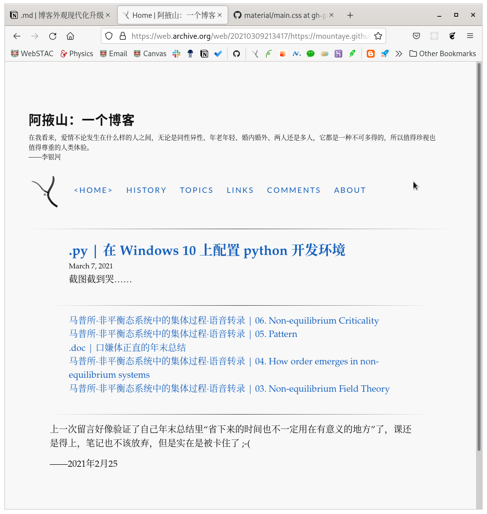 早就想给博客改版了,一直拖着不办的原因主要是直接把博文复制粘贴到新模板的 /_posts 文件夹之后会报错,不知道排错需要多长时间,于是压根就不动手了。因为旧版通过 jekyll 实现了一些正常 markdown 文档没有的功能,我用到的主要就是侧边栏的边注 sidenote,以及在正文内部插入图片的 maincolumn。
