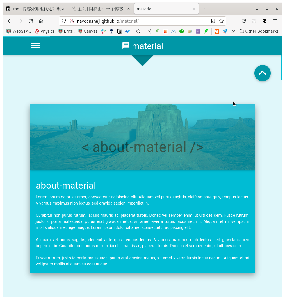 Material Design 是 Google 推出的一个组件库,提供类似纸张和卡片的视觉效果,就给人一种很现代的感觉,内心觊觎已久。GitHub 的这个 repository 就用了这套设计风格,虽然已经不再更新维护了,但是已有的功能,比如点击链接之后的加载页面,页面顶端的阅读进度条,我觉得让我自己来的话,十年之内都不一定能学到做出这些效果的技术,于是就直接拿来用了。