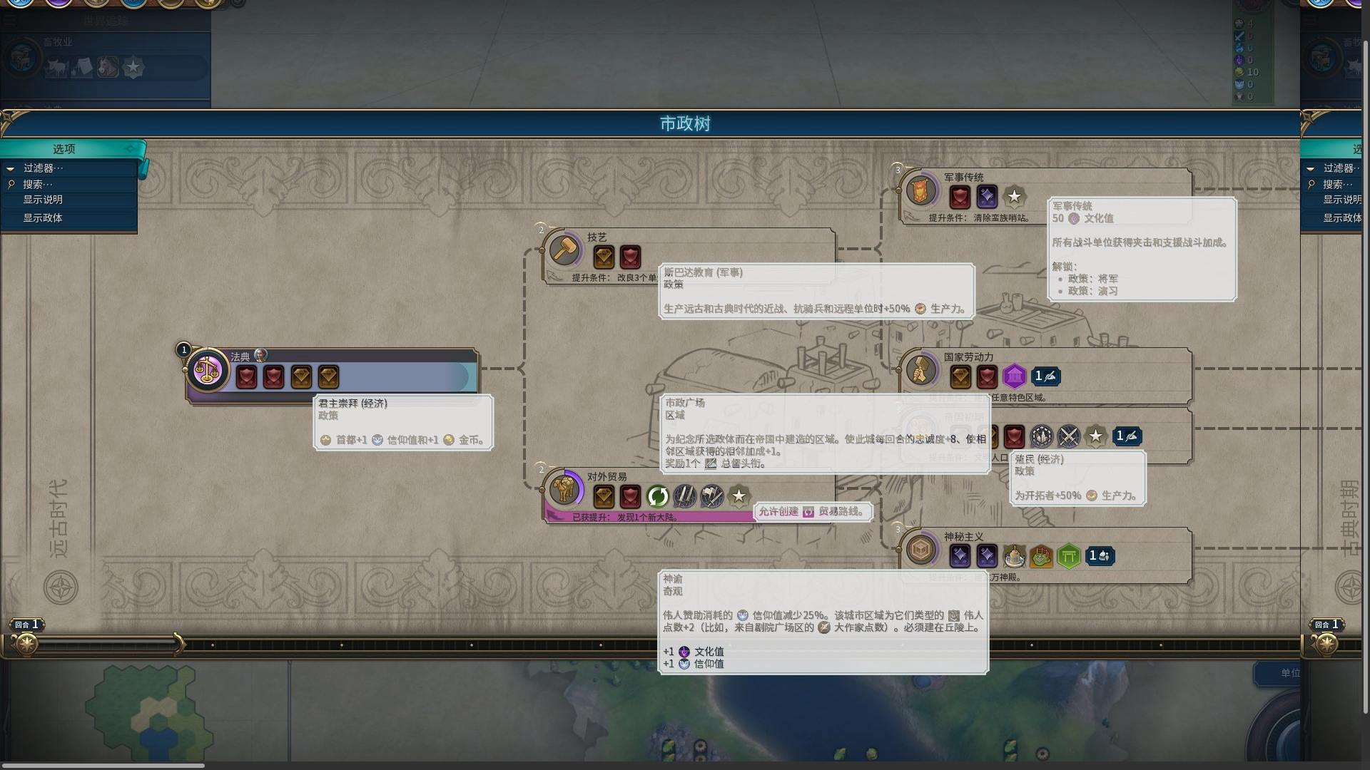 - 左键单击感兴趣的科技/市政,左上角显示需要研发的数目。鼠标移到重要的功能/政策卡/建筑的图标上,显示介绍浮窗。