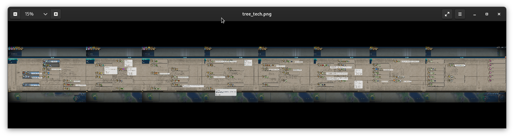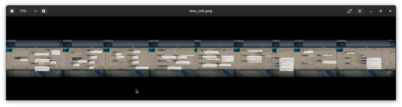 对于最后一条,咱就可以发挥自己特别能内卷的优势了。虽然科技和市政是随机的,但是各个项目所对应的时代应该是不变的,所以原始的固定科技/文化树依然有很高的参考价值。把科技树和文化树背下来难度太高了,所以只能考虑在游戏过程中在第二设备上显示。由于没有独立显卡,在笔记本上另外运行一个游戏界面的方案就不可行了,于是考虑截图。用了一个下午加一个 OPT/CPT/H1B 讲座的时间,大功告成。