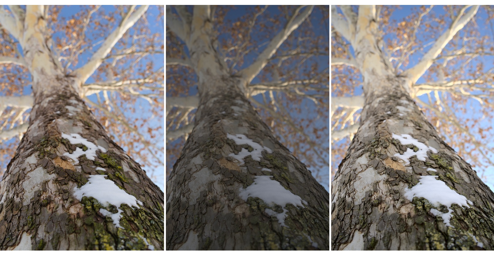 更进一步,就连询问对方是不是原片直出这一事实也没有什么意义。按照原片直出的第一种定义,.jpg 格式的照片包含的信息量就比 RAW 图像少很多,在明明有能力获得更多信息的情况下选择主动丢弃这些信息,对于一个创作者来说实在是很不明智,一般只在多款机型的横向测评中作为对照参考;按照第二种定义,使用 RAW 格式中更丰富的信息生成 .jpg 格式的图片,这个过程需要图像处理软件的参与,而不同软件的算法不同,导出结果是不一样的。比如下图,分别给出了 RawTherapy 不加任何操作导出、DarkTable 手动移除软件自动调整然后导出、DarkTable 使用软件自动调整导出3种不同的结果,差别非常明显。在这种情况下,哪一种算是原片直出呢,原片直出又如何呢?