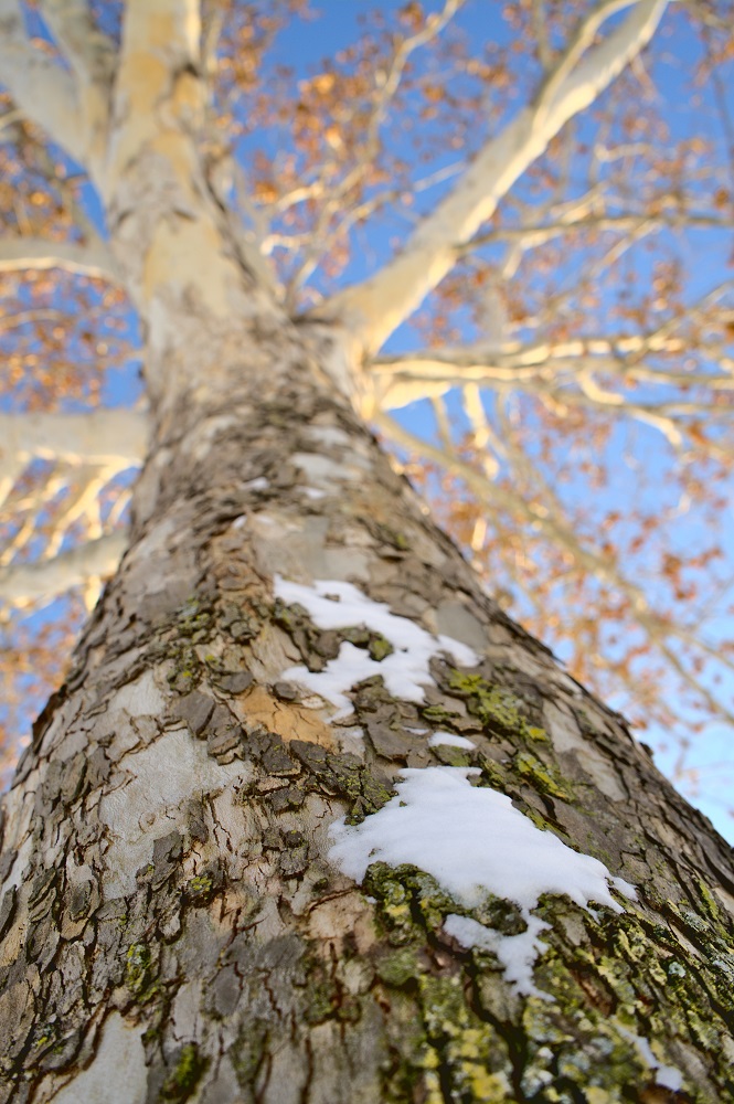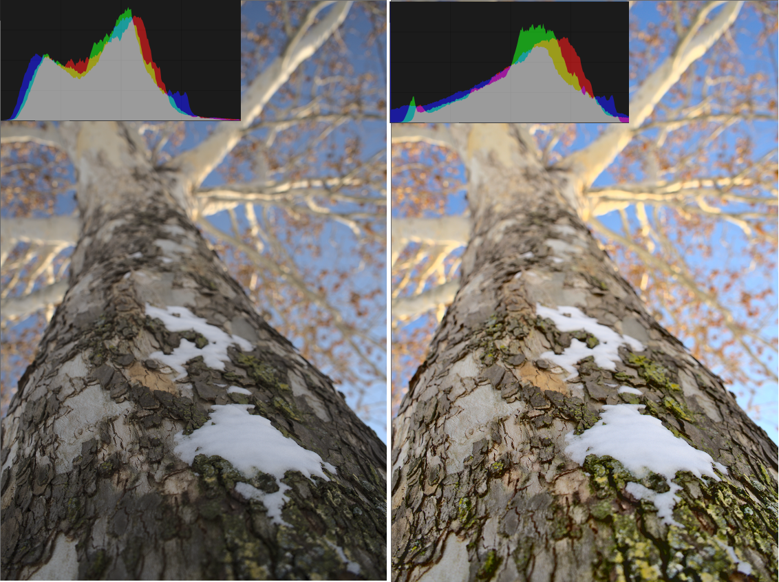 处理的方法也很简单,DarkTable 的直方图可以直接拖动,而且最暗的四分之一和较亮的部分可以分开处理,所以就直接把直方图的右半边往右拉,左边往左拉,使得一部分的像素过曝,同时一部分的暗部完全压暗成黑色。这样做是因为看到图片中最白的像素一定来自雪,而黑色来自树皮上的皴裂,将两者的色彩对比拉开之后,图片自然就会显得通透,也符合尽可以贴近自己眼前所见的原则。另外色彩的饱和度稍微提高一些,为了避免过于鲜艳,把对比度稍微降低一些,但是这些操作对于整体效果的影响不大。
